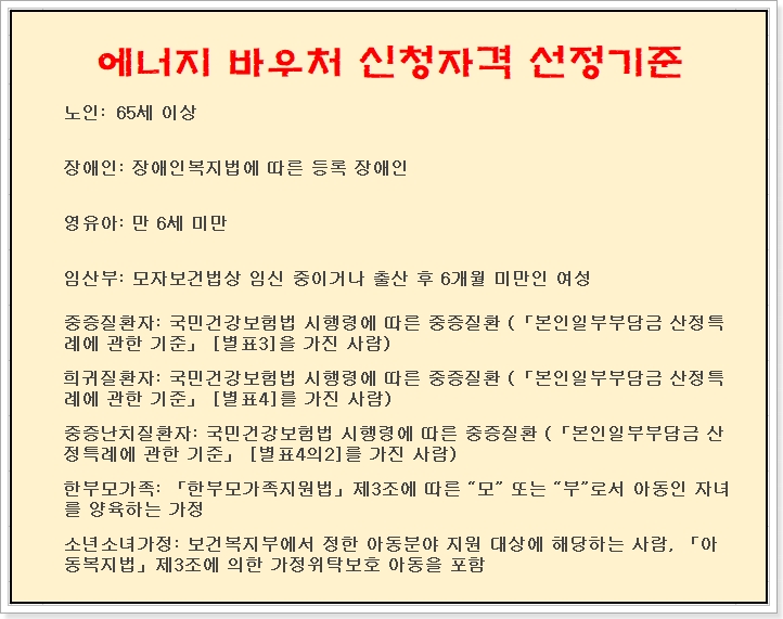 에너지 바우처를 지원하는 에너지 취약계층 신청자격과 신청방법을 아래에 공유합니다.