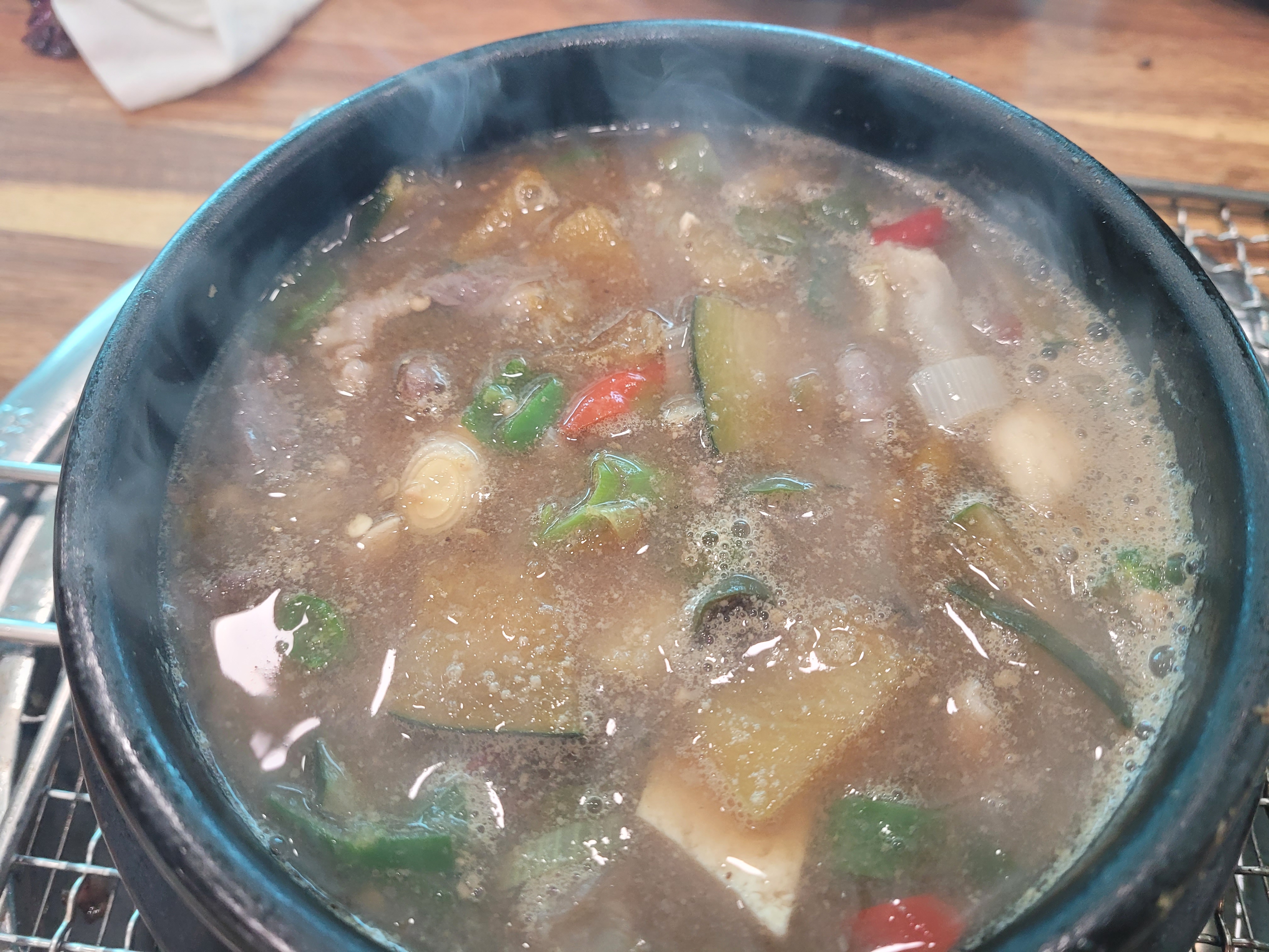 고기로 배를 채웠으니 이제 밥으로 배를 달래줘야 할 시간입니다. 눈으로 보기만해도 얼큰한 된장찌개가 나오고 온도를 유지하기 위해서 불판위에 그대로 올려집니다.