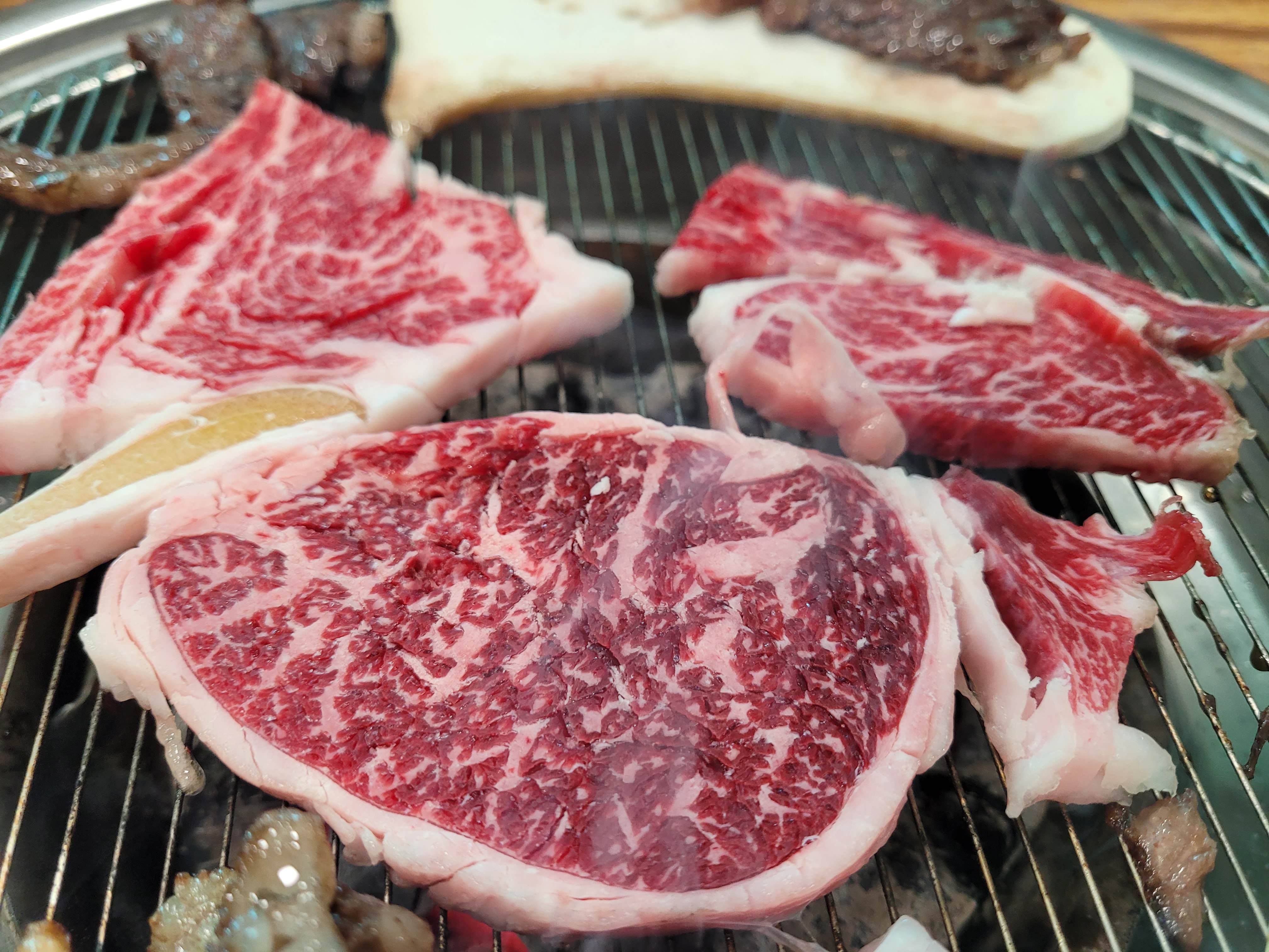 첫 주문으로 꽃등심 5인분이 4명이 먹기엔 좀 모자랐나 봅니다. 추가로 꽃등심 3인분을 더 시키고 2차전에 돌입했습니다. 이번엔 또 다른 맛의 꽃등심을 느껴볼 수 있을지 기대감을 갖고 불판 위로 이놈들을 올려다 놓습니다.