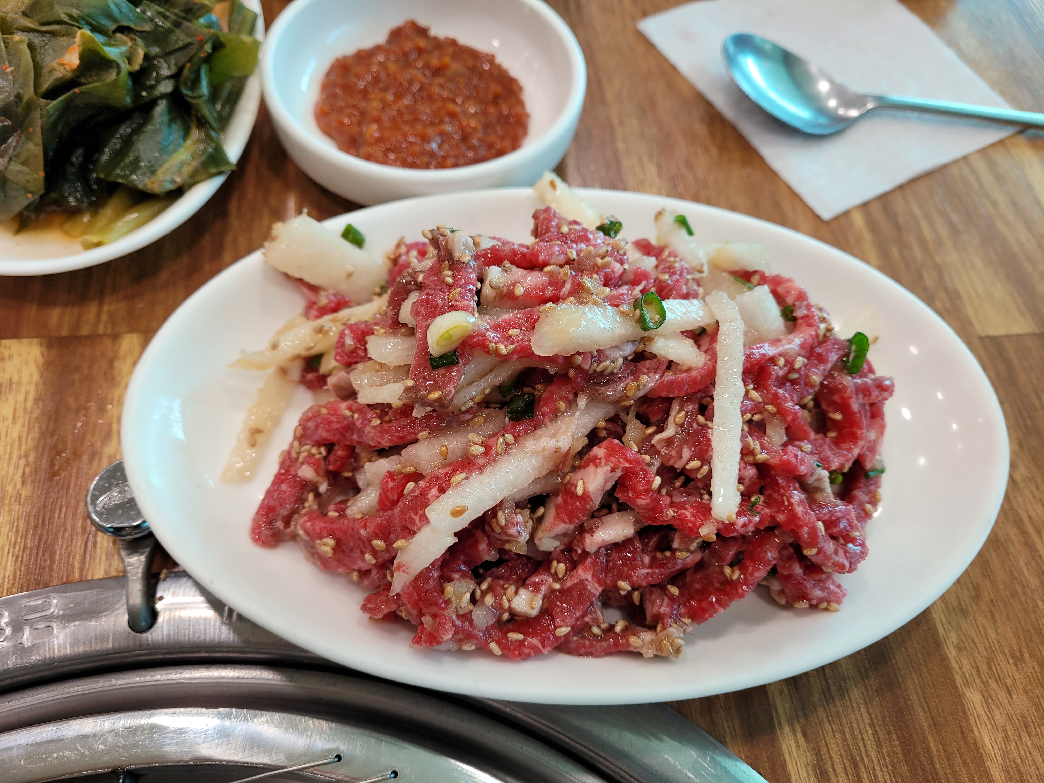 아래에 요것이 꽃등심이 나오기전에 제공되는 육회입니다. 깨소금과 참기름이 생고기와 잘 버무려져서 고소하고 달달한 맛이 제대로입니다. 육회를 좋아하는 분들에게는 입맛을 돋기구에 딱 좋은 식전메뉴인 듯 합니다.