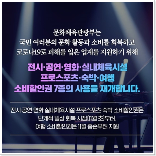 코로나19 사태로 인해 위축된 국내 소비경기를 회복시키기 위해 정부와 문화체육관광부에서는 소비쿠폰 및 소비할인권 사용을 재개했습니다. 11월 1일부터 단계적 일상회복 1단계가 시작되면서 코로나19 바이러스 발생전 일상으로 돌아갈 준비를 하고 있습니다. 이와 함께 문체부에서는 총 7개 분야의 소비할인권을 발행하여 국민들의 문화여가 생활을 지원하고 국내 경제를 활성화시키고자 합니다.